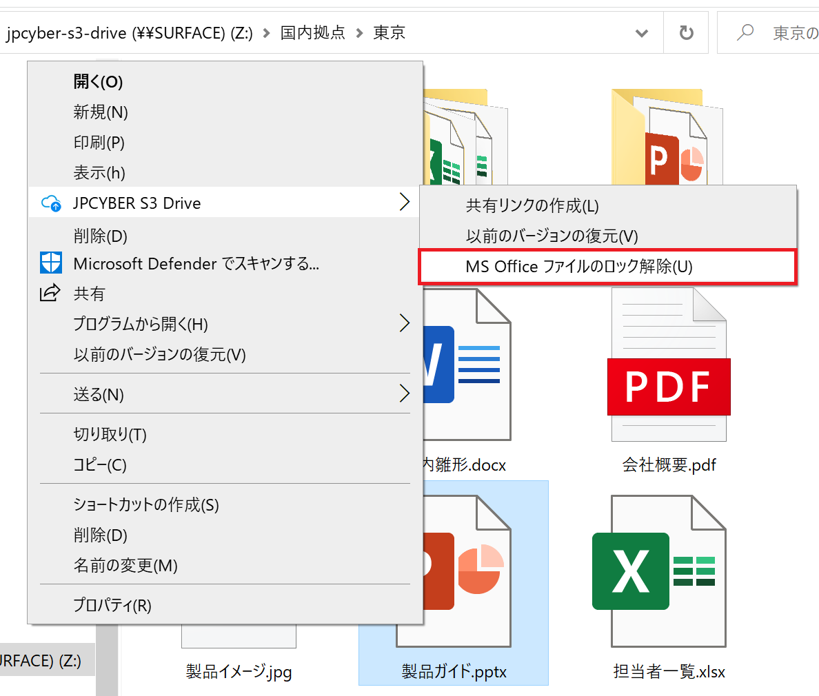 Microsoft Office ファイルのロック機能は、社内 LAN で Office ファイルを利用している時と全く同じ操作感でお使いいただけます。