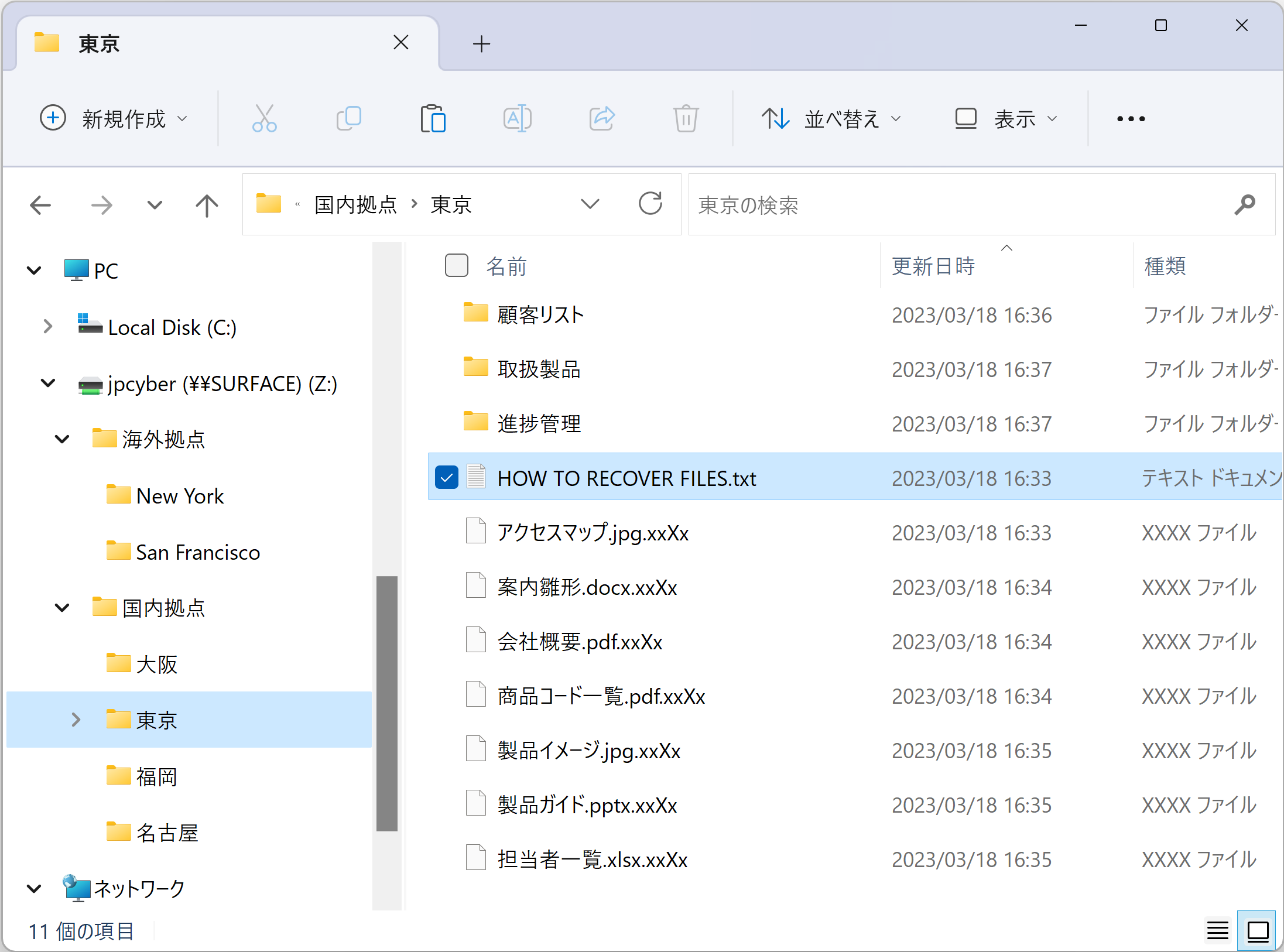 エクスプローラーでファイルを更新日時順に並び替え、ランサムウェアに感染したおおよその日時を特定します。